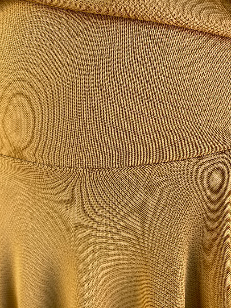 This draped halter-neck, open-back dress features a rich golden-yellow hue. Perfect for a summer evening or a special occasion, this dress combines effortless elegance with a modern twist.