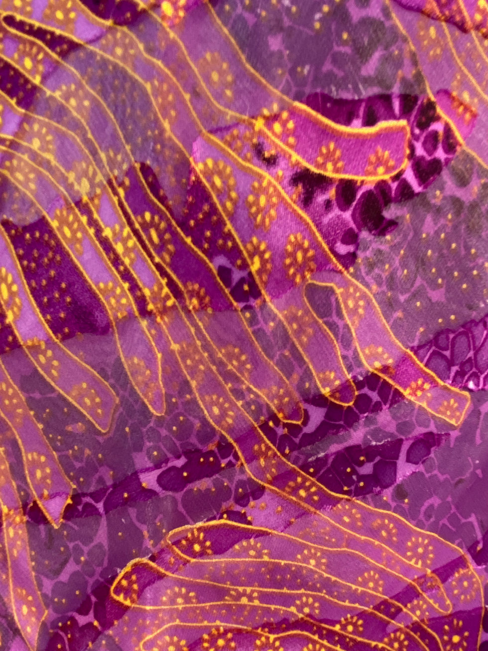 Sleek, tropical-inspired maxi dress in shimmery purple fabric with a V-neckline and asymmetrical hem. Perfect for a stylish, summery look.