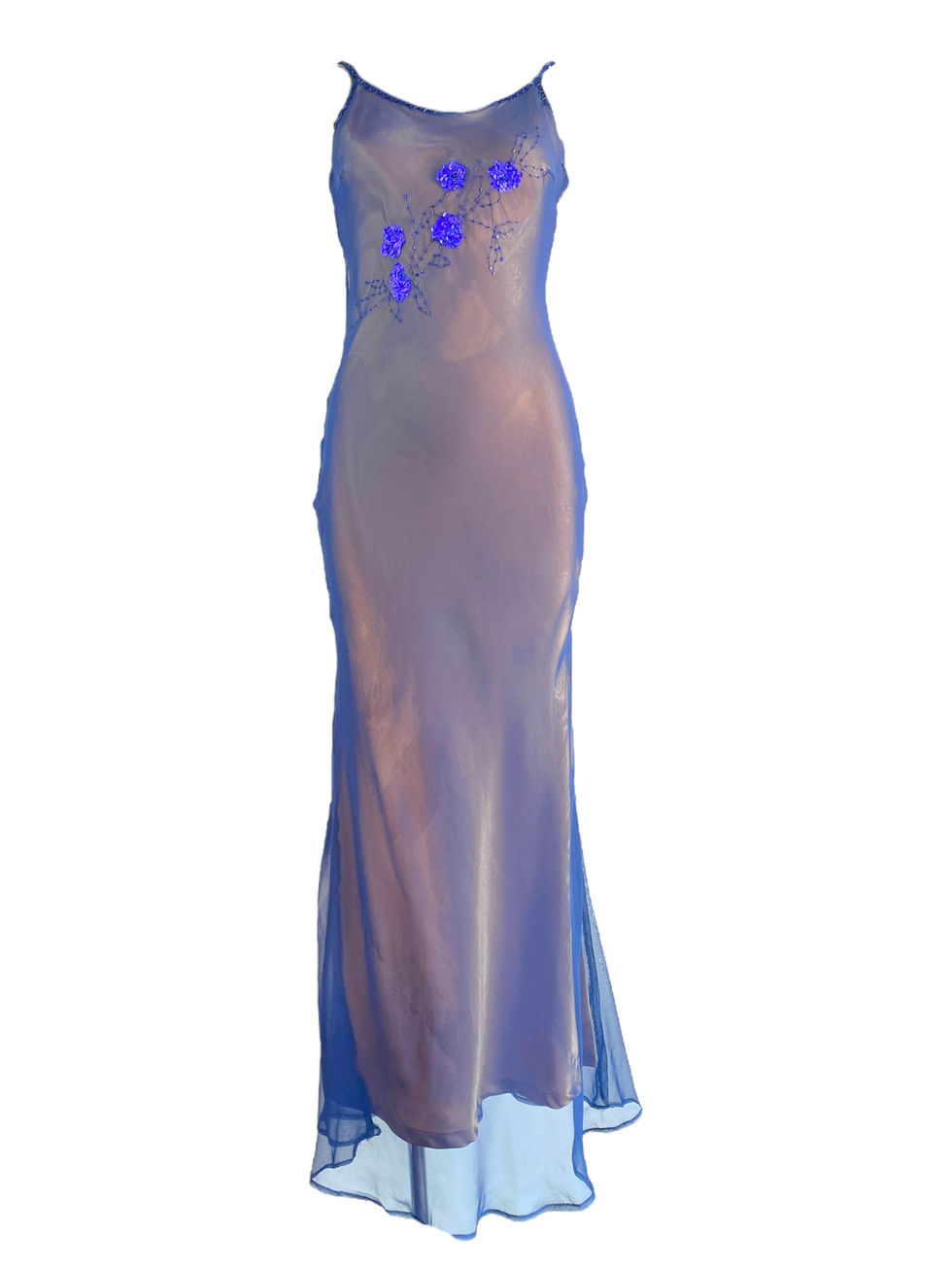 Experience the enchantment of the Sapphire Dream Gown. This long, flowing dress features an iridescent blue fabric that shimmers with every movement. Delicate blue floral embellishments adorn the bodice, adding a touch of romance. The thin straps and scoop neckline offer a flattering silhouette, while the sheer, flared skirt creates a graceful, flowing effect. Perfect for making a statement at any special event.