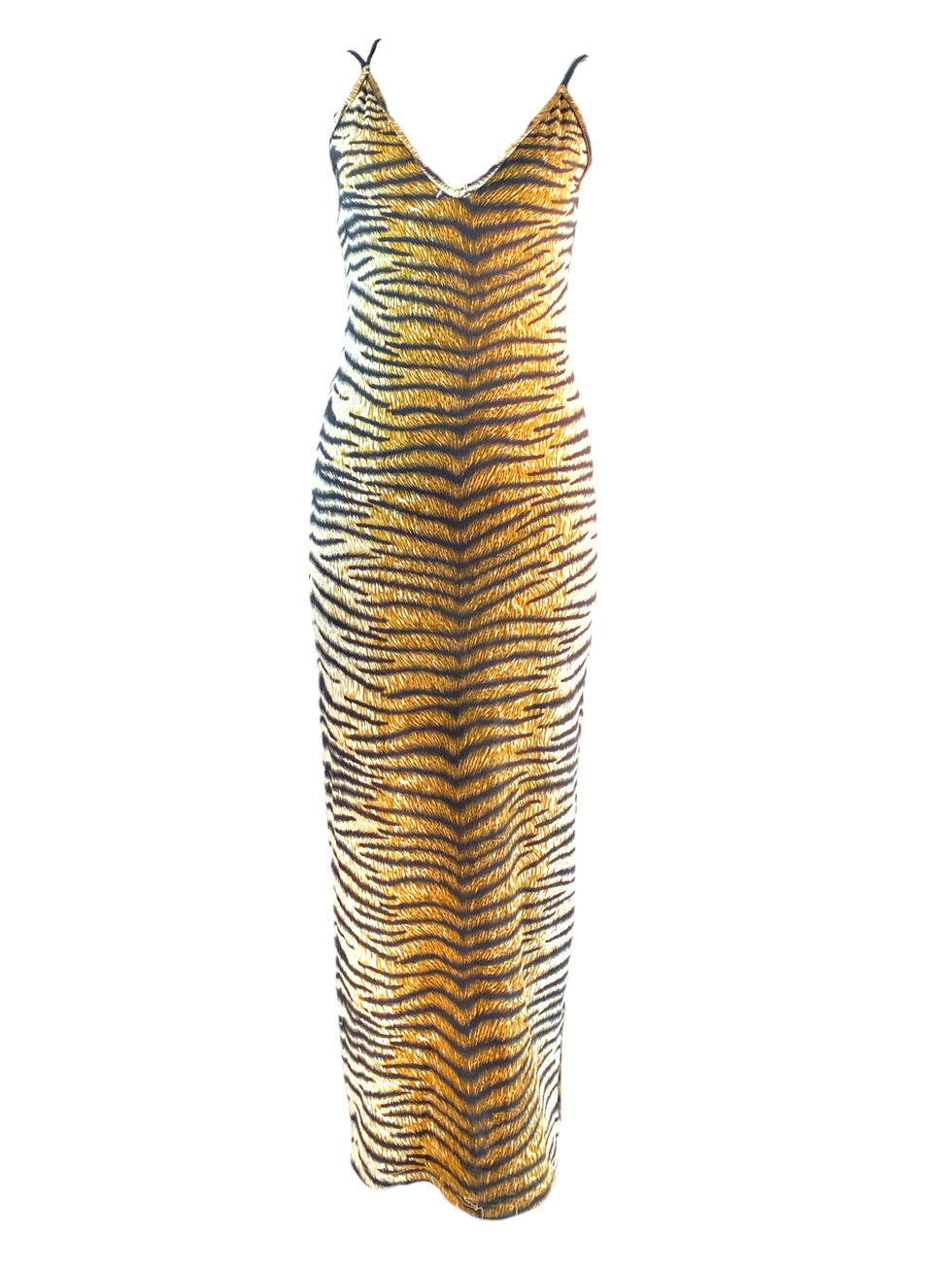 Unleash your inner confidence with this full-length, sexy dress which features striking tiger stripes. The sleek silhouette drapes beautifully, creating a look that is both powerful and elegant.