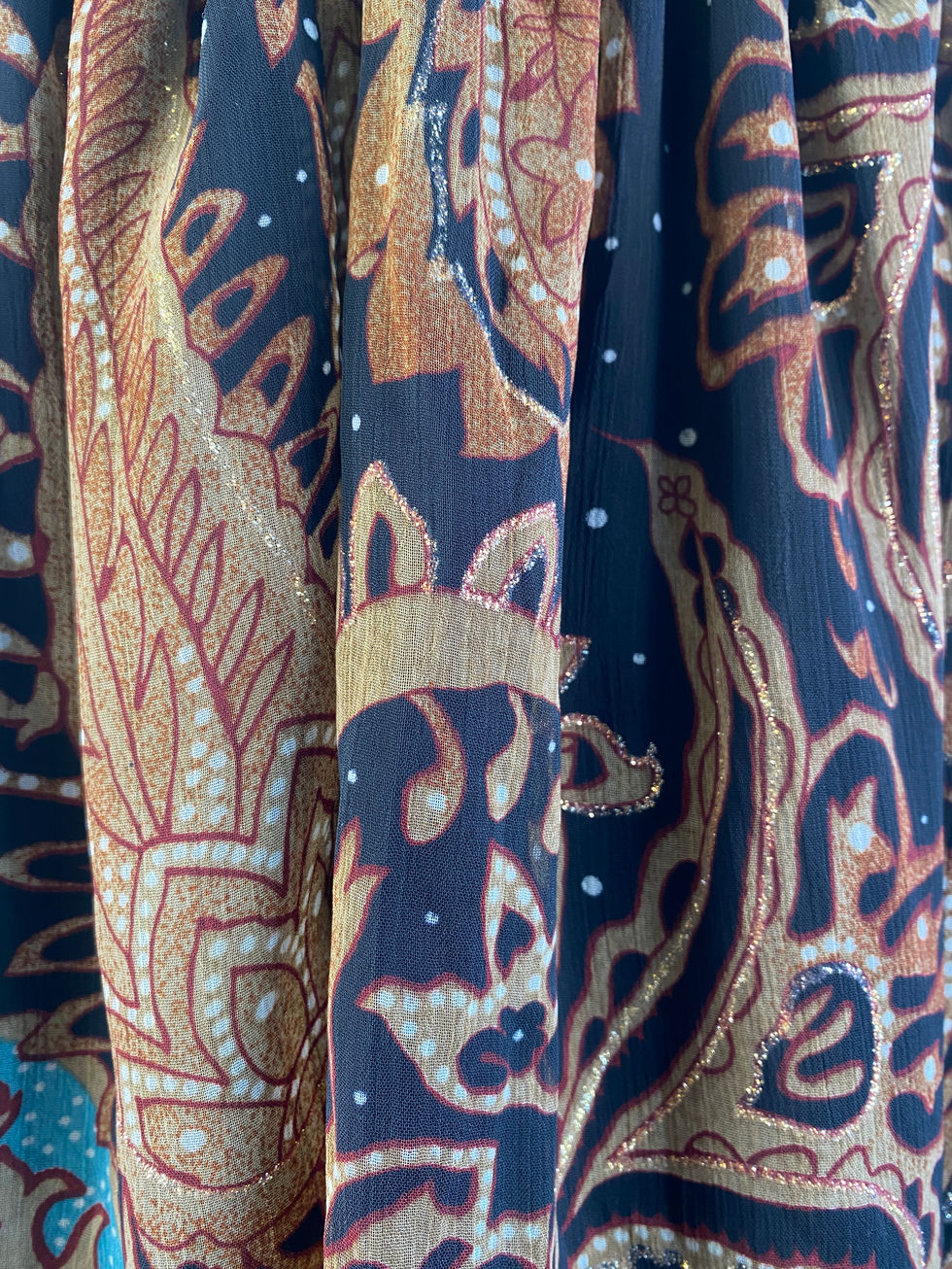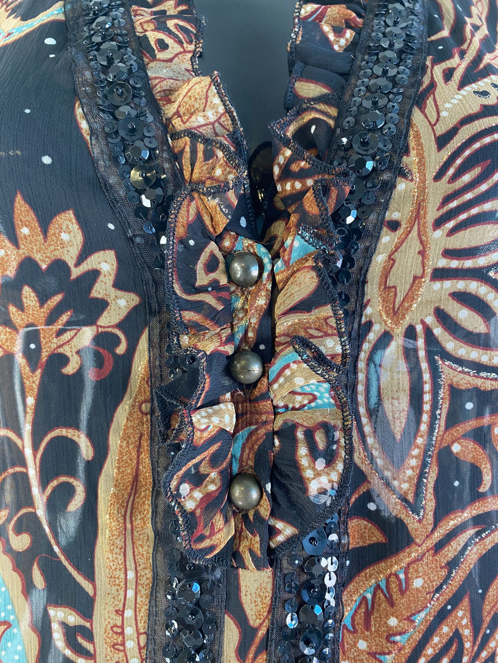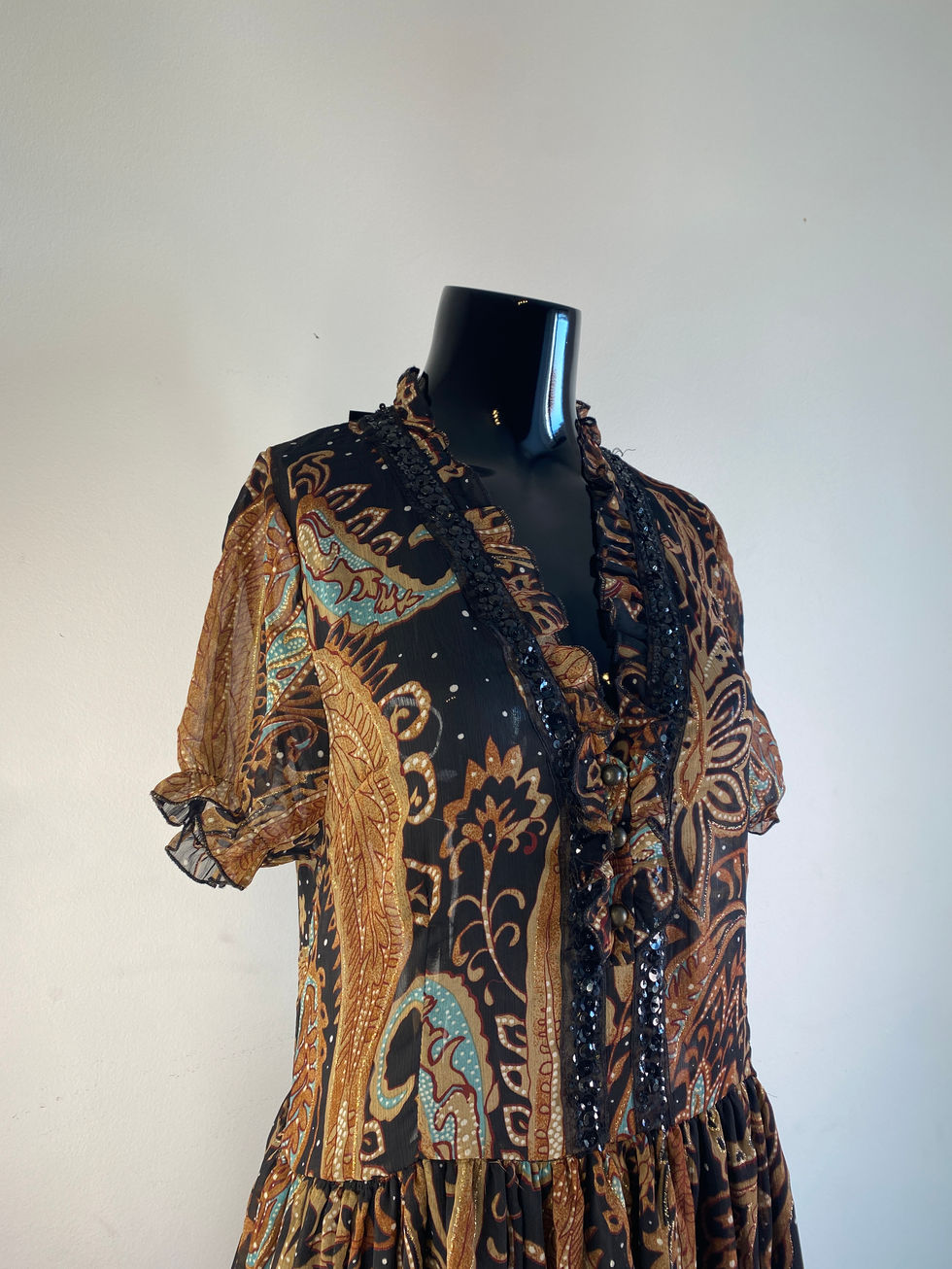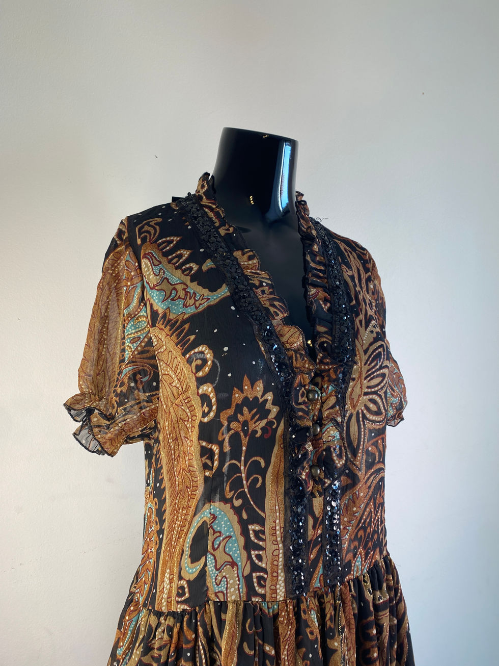 Embrace timeless elegance with this vintage-inspired piece which features a high neckline and short sleeves, exuding classic charm. The intricate paisley pattern, in rich navy, orange, and gold hues, adds a touch of sophistication. Delicate ruffles adorn the hemline, enhancing the dress's graceful movement. With its flattering silhouette and refined details, this dress is perfect for any occasion where you want to make a lasting impression.