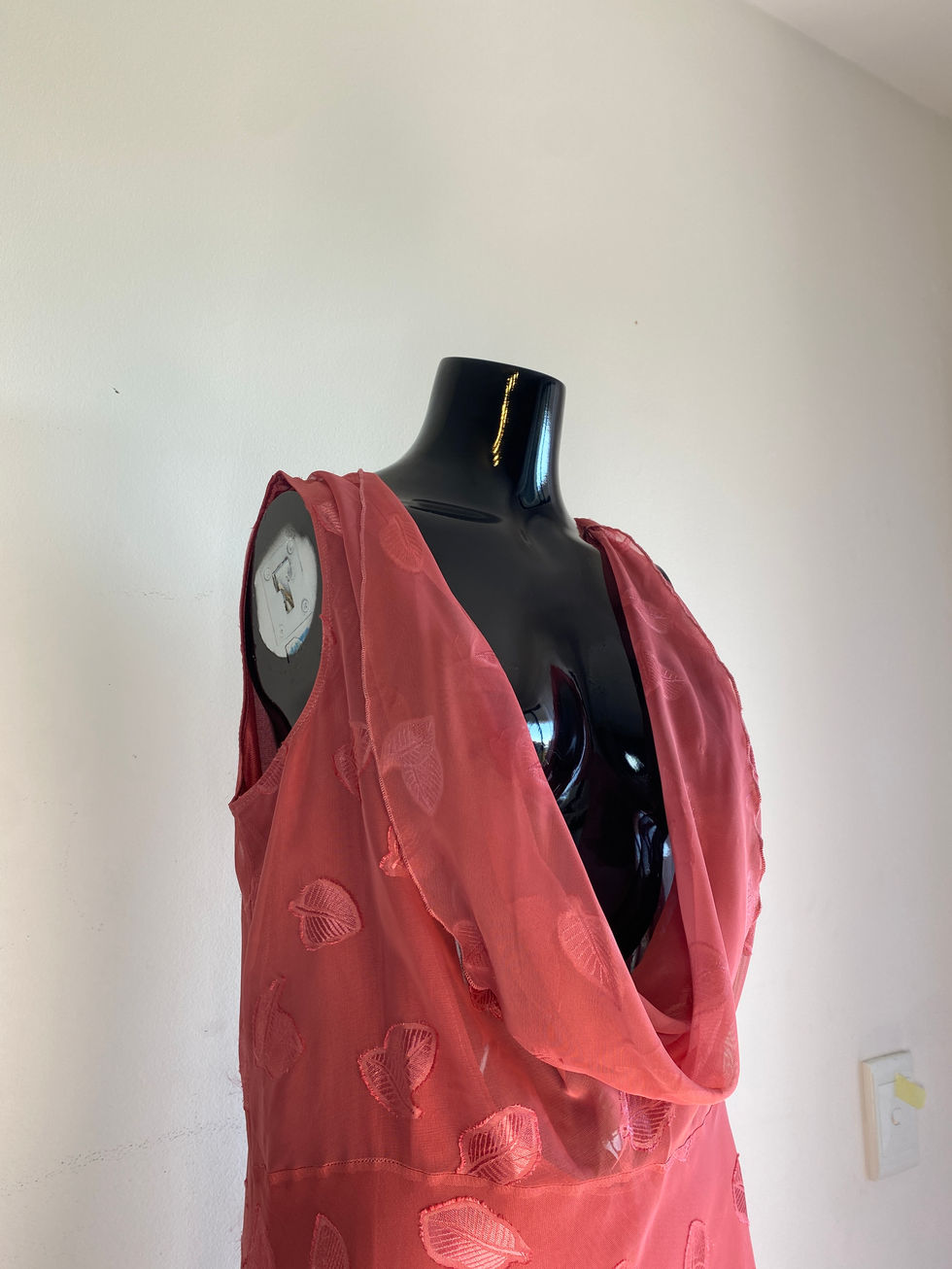 This dress features a delicate cowl neckline and soft draping that cascades effortlessly. Embroidered with whimsical leaves, adding a playful yet refined texture.