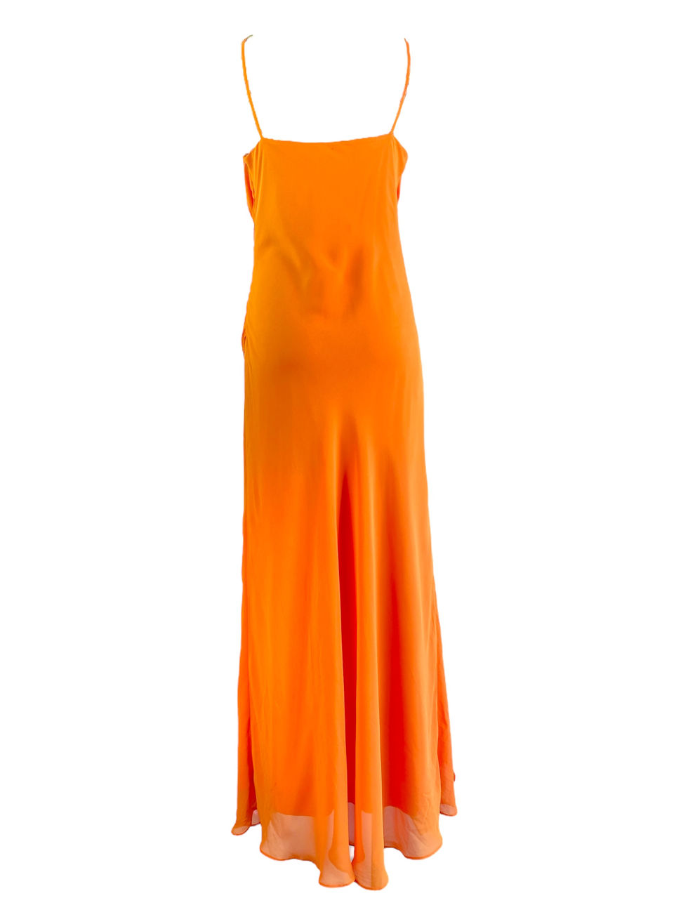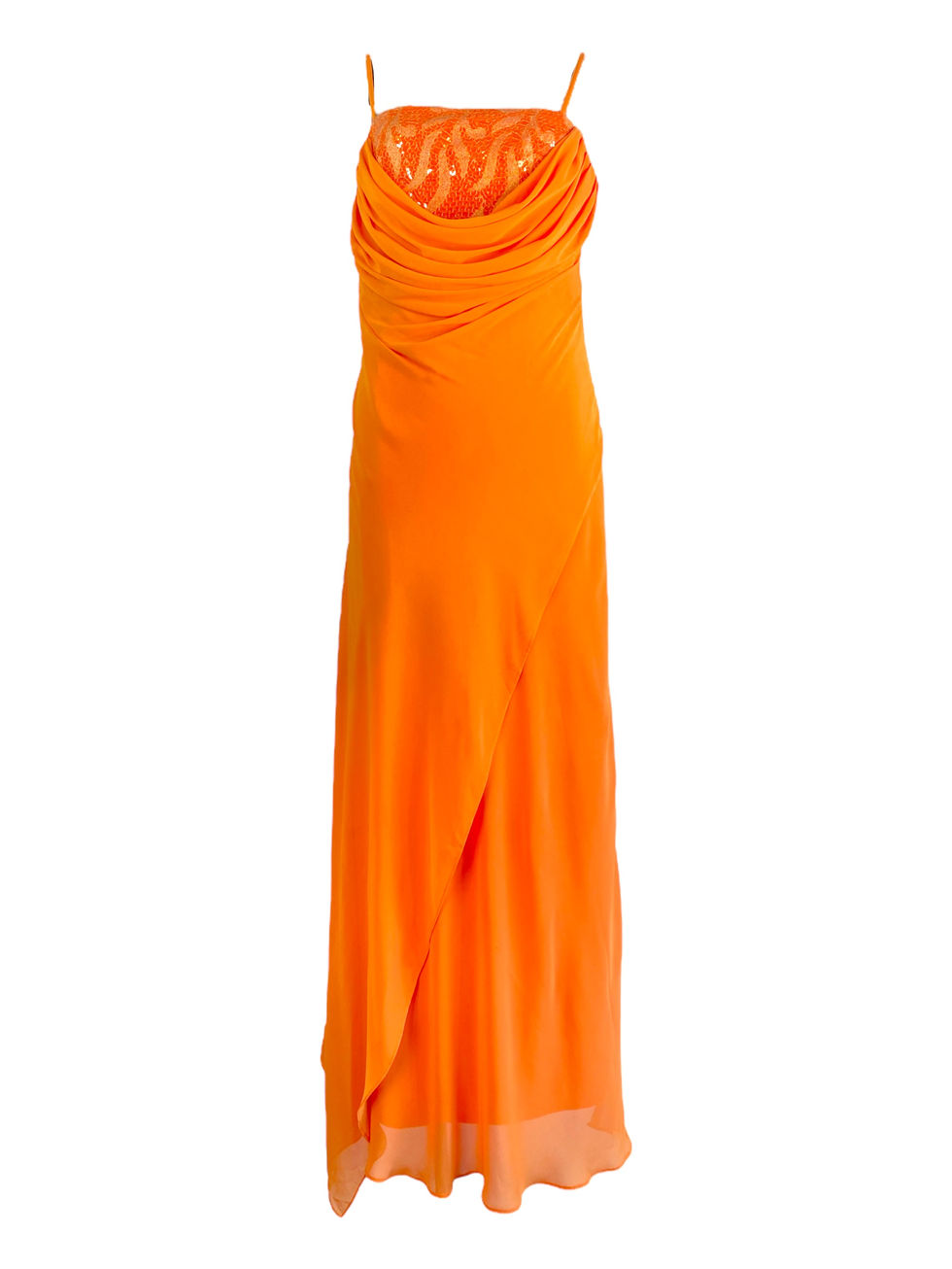 Make a grand entrance in this breathtaking gown. The dress features a fitted bodice adorned with shimmering sequins, leading into a draped design that accentuates the figure. The flowing skirt, complete with a subtle slit, cascades to the floor in a vibrant orange hue. This gown is designed to captivate and charm, making it ideal for galas and formal evenings.